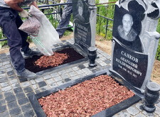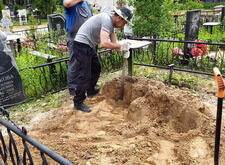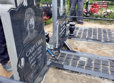 Первым делом мы подготовили участок к работам: демонтировали уже установленное надгробье, а также разровняли почву на могиле, тем самым подготовив её к укладке наземного покрытия.
