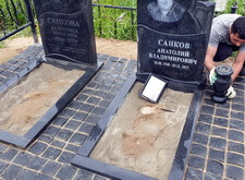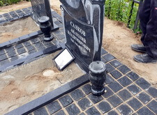 Памятник аккуратнейшим образом крепим на подставку, к которой пристраиваем цветник. Ту же операцию повторяем и со вторым надгробьем. Памятники выставляем строго на одной линии, параллель, а также горизонталь цветников проверяем с помощью уровня. Чёткая установка исключает не только наличие визуальных дефектов, но и имеет практическое значение: поставленный «как надо» памятник в дальнейшем не завалится на бок, а благодаря обкладке брусчаткой и не просядет вниз.
