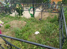 Далее мы перекрасили ограждение, установили подставку, сам памятник, прямоугольный цветник. Работу заканчивали в дождь, поэтому фотографий сухого место захоронения нет. На последнем снимке чётко видно, что даже на мокром памятнике выгравированная надпись очень легко читается.