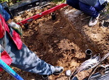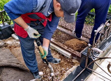 Далее приступаем к установке подставки памятника. После того, как она была возвращена на своё место, размечаем цветник. Параллельно работаем с периметром могилы: по краю пускаем металлическую планку, которая послужит границей брусчатки.