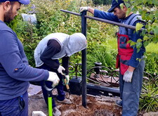 Затем вкручиваем в землю четыре двухметровые металлические сваи, которые будут являться опорой для основания.